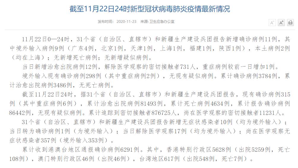 人民網(wǎng)北京11月23日電(董童)國(guó)家衛(wèi)生健康委于今日在官網(wǎng)發(fā)布的《截至11月22日24時(shí)新型冠狀病毒肺炎疫情最新情況》(以下簡(jiǎn)稱“情況”)指出,11月22日0—24時(shí),31個(gè)省(自治區(qū)、直轄市)和新疆生產(chǎn)建設(shè)兵團(tuán)報(bào)告新增確診病例11例,其中境外輸入病例9例(廣東4例,北京1例,天津1例,上海1例,福建1例,陜西1例),本土病例2例(均在上海);無(wú)新增死亡病例;無(wú)新增疑似病例。當(dāng)日新增治愈出院病例12例,解除醫(yī)學(xué)觀察的密切接觸者731人,重癥病例較前一日增加1例。