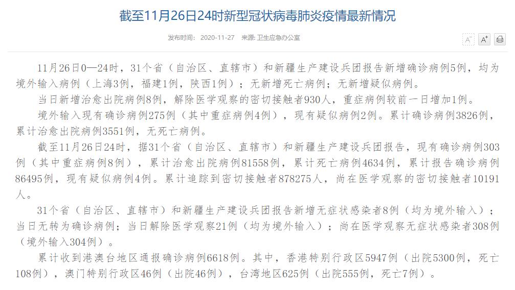 人民網(wǎng)北京11月27日電(董童)國(guó)家衛(wèi)生健康委于今日在官網(wǎng)發(fā)布的《截至11月26日24時(shí)新型冠狀病毒肺炎疫情最新情況》(以下簡(jiǎn)稱“情況”)指出,11月26日0—24時(shí),31個(gè)?。ㄗ灾螀^(qū)、直轄市)和新疆生產(chǎn)建設(shè)兵團(tuán)報(bào)告新增確診病例5例,均為境外輸入病例(上海3例,福建1例,陜西1例);無(wú)新增死亡病例;無(wú)新增疑似病例。當(dāng)日新增治愈出院病例8例,解除醫(yī)學(xué)觀察的密切接觸者930人,重癥病例較前一日增加1例。