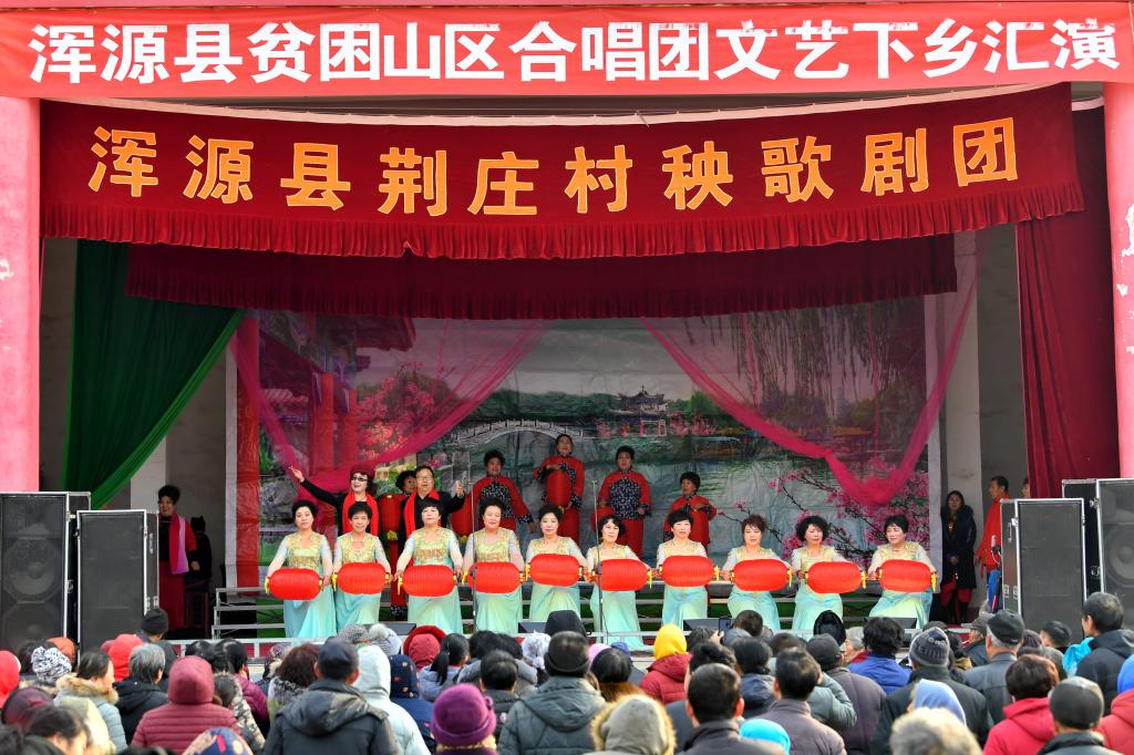 ↑1月3日,在山西省渾源縣荊莊村,渾源縣貧困山區(qū)合唱團(tuán)在表演合唱《紅梅贊》。