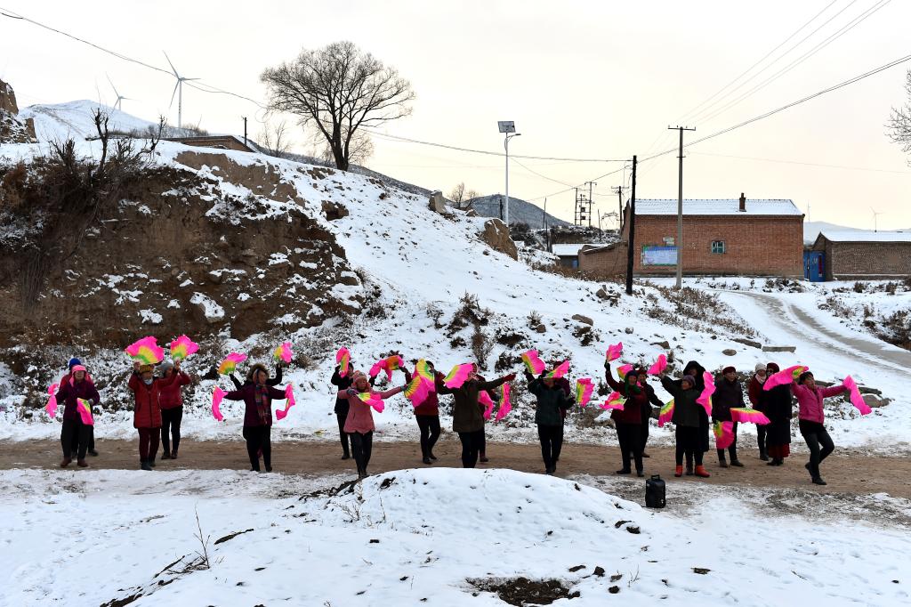 ↑1月3日,在山西省渾源縣荊莊村,渾源縣貧困山區(qū)合唱團(tuán)在表演舞蹈《大豐收》。