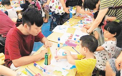 圖為臺(tái)灣實(shí)習(xí)生在北京首都圖書(shū)館少兒閱覽室教小朋友做手工。李晗雪 攝