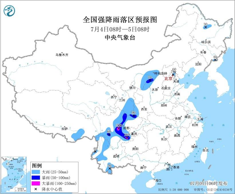 預(yù)計(jì),7月4日8時(shí)至5日8時(shí),內(nèi)蒙古河套地區(qū)、甘肅東部、寧夏南部、陜西北部和西南部、山西北部、四川盆地西部和南部、云南西部、西藏東部等地部分地區(qū)有大到暴雨,其中,四川盆地西部和南部等地局地有大暴雨(100~200毫米)。上述部分地區(qū)伴有短時(shí)強(qiáng)降水(最大小時(shí)降雨量20~50毫米,局地可超過70毫米),局地有雷暴大風(fēng)等強(qiáng)對流天氣。