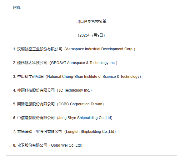 商務部公告2025年第35號 公布將8家臺灣地區(qū)實體列入出口管制管控名單