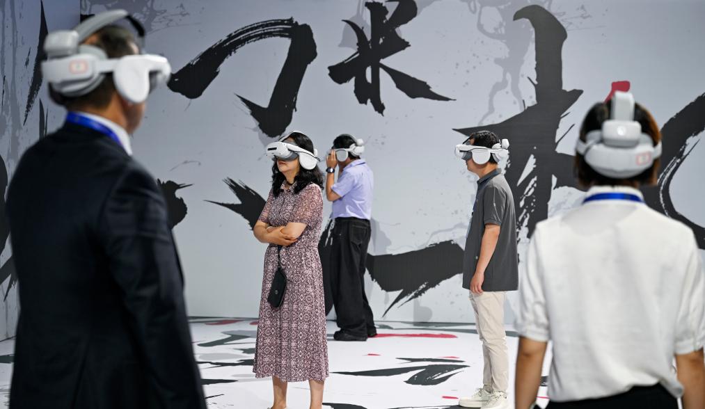 7月4日,2025上海合作組織國(guó)家電影節(jié)電影市場(chǎng)開幕式及電影科技成果展覽啟動(dòng)活動(dòng)在重慶永川國(guó)際會(huì)展中心舉行,嘉賓觀看中國(guó)電影科技企業(yè)的虛擬影片。新華社記者 陳誠(chéng) 攝