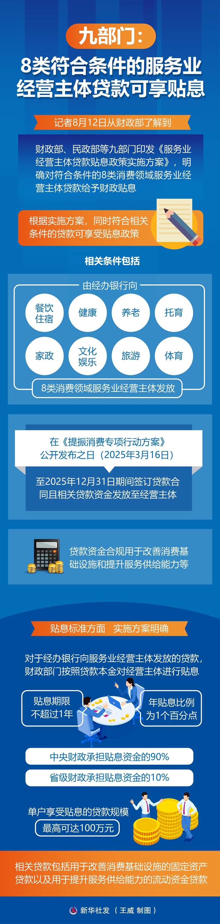 新華社北京8月12日電(記者申鋮)記者12日從財(cái)政部了解到,財(cái)政部、民政部等九部門(mén)印發(fā)《服務(wù)業(yè)經(jīng)營(yíng)主體貸款貼息政策實(shí)施方案》,明確對(duì)符合條件的8類消費(fèi)領(lǐng)域服務(wù)業(yè)經(jīng)營(yíng)主體貸款給予財(cái)政貼息。