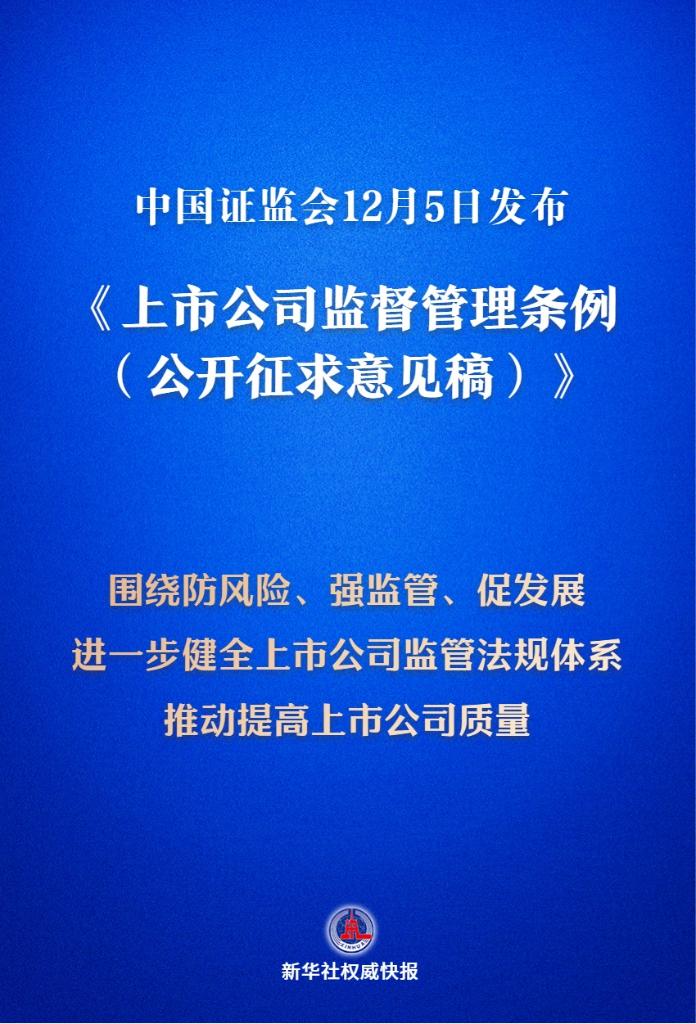 新華社北京12月5日電(記者劉羽佳)中國證監(jiān)會5日發(fā)布《上市公司監(jiān)督管理條例(公開征求意見稿)》,我國將迎來首部專門的上市公司監(jiān)管行政法規(guī)。
