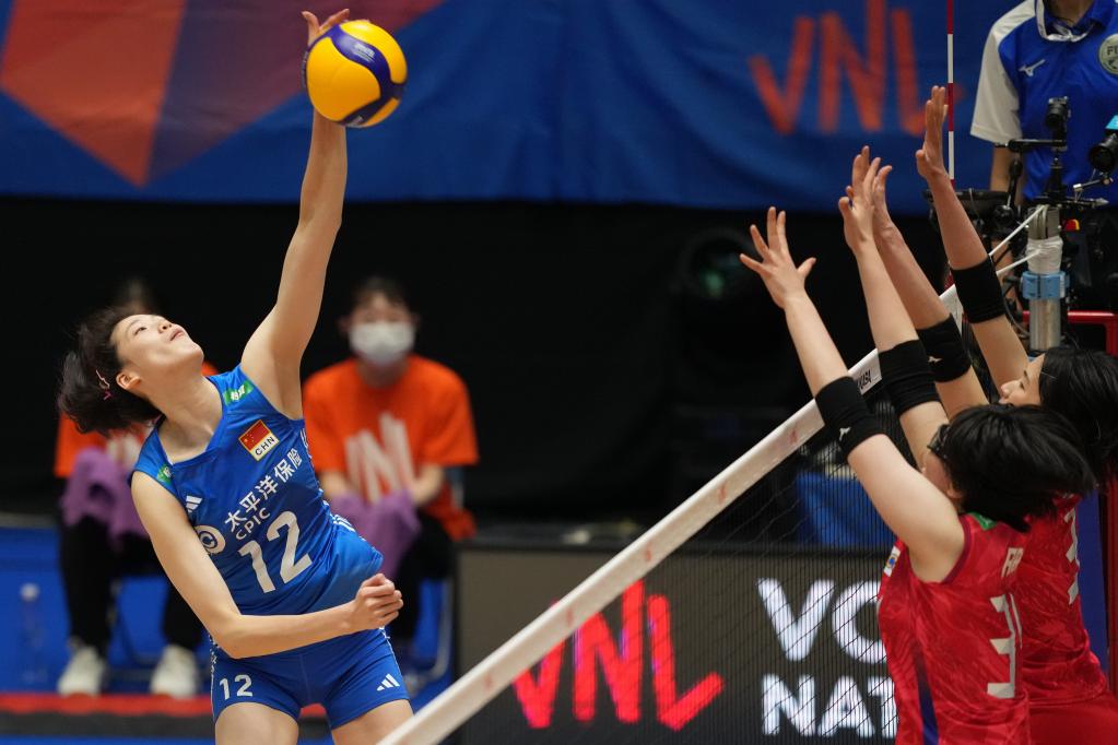 6月4日,中國隊(duì)球員李盈瑩(左)在比賽中扣球。新華社記者 張笑宇 攝