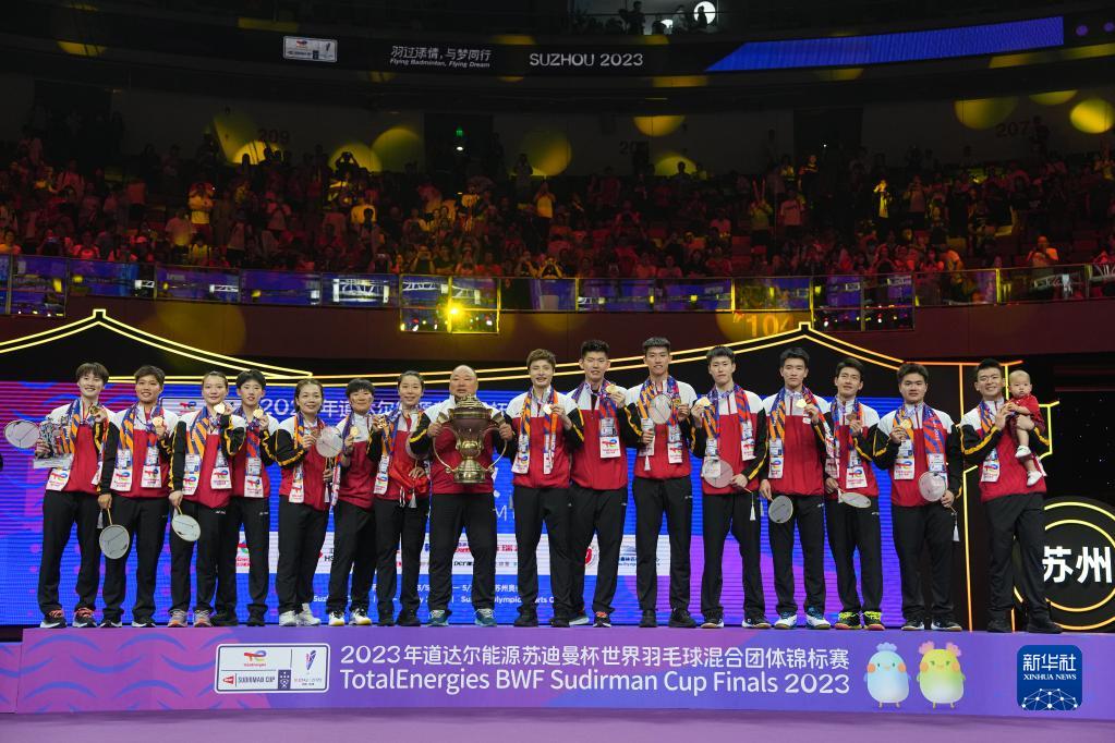 5月21日,2023年蘇迪曼杯世界羽毛球混合團(tuán)體錦標(biāo)賽頒獎(jiǎng)儀式在江蘇省蘇州市舉行。中國(guó)隊(duì)在決賽中以3比0戰(zhàn)勝韓國(guó)隊(duì),奪得冠軍。圖為中國(guó)隊(duì)在頒獎(jiǎng)儀式上慶祝。新華社記者 杜宇 攝