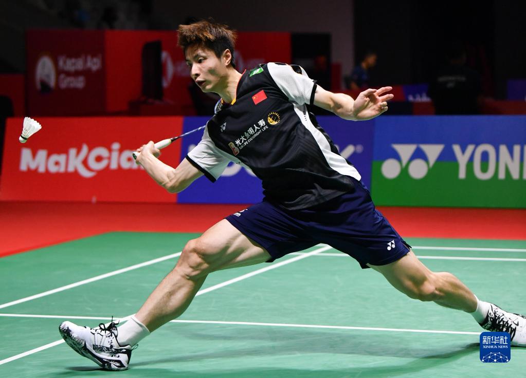 6月13日,石宇奇在雅加達(dá)舉行的2023年印度尼西亞羽毛球公開(kāi)賽男單比賽中回球。新華社記者 徐欽 攝
