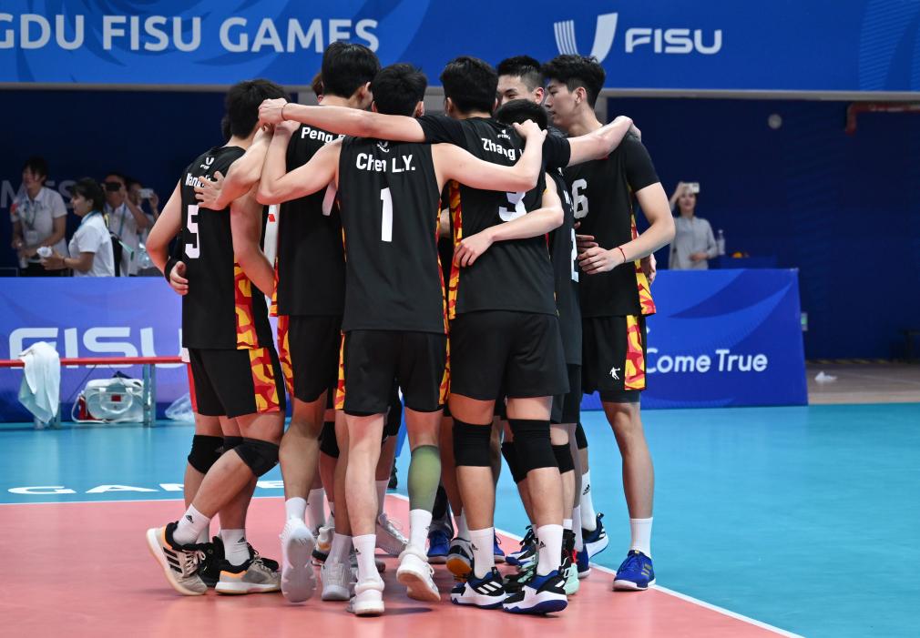 7月31日,中國男排球員在獲勝后慶祝。新華社記者 胥冰潔 攝