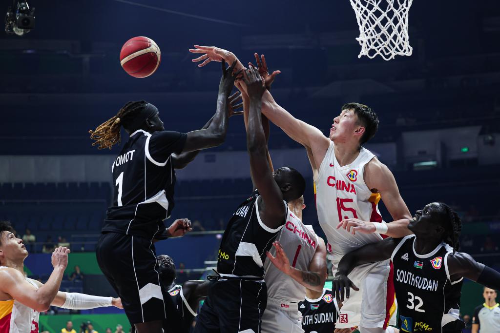 8月28日,中國(guó)隊(duì)球員周琦(右二)在比賽中拼搶。當(dāng)日,在菲律賓馬尼拉舉行的2023年籃球世界杯B組小組賽中,中國(guó)隊(duì)以69:89不敵南蘇丹隊(duì)。新華社記者 吳壯 攝