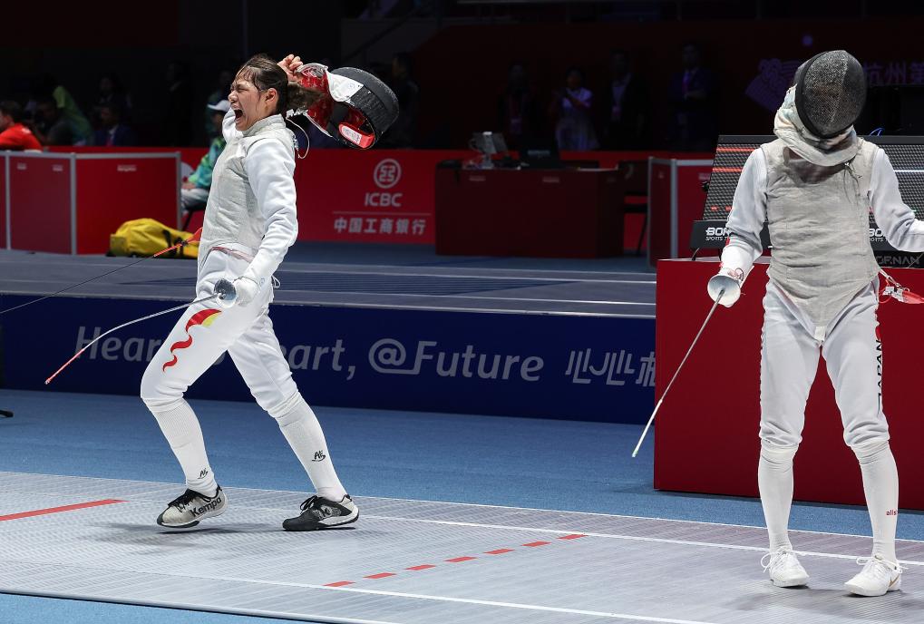 25日,杭州亞運會女花個人決賽中,隨著黃芊芊刺中制勝一劍,顯示器上的比分定格在15:8。這位21歲的中國女花新星,為中國擊劍隊斬獲本屆亞運會首金。