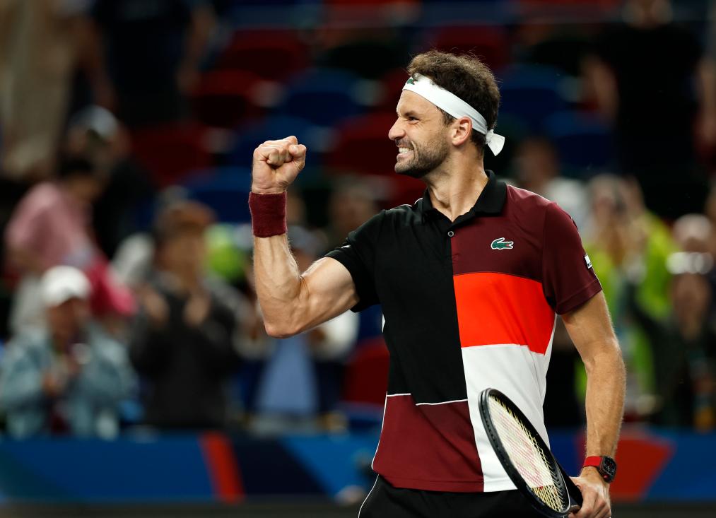 10月11日,迪米特洛夫慶祝比賽獲勝。新華社記者 王麗莉 攝