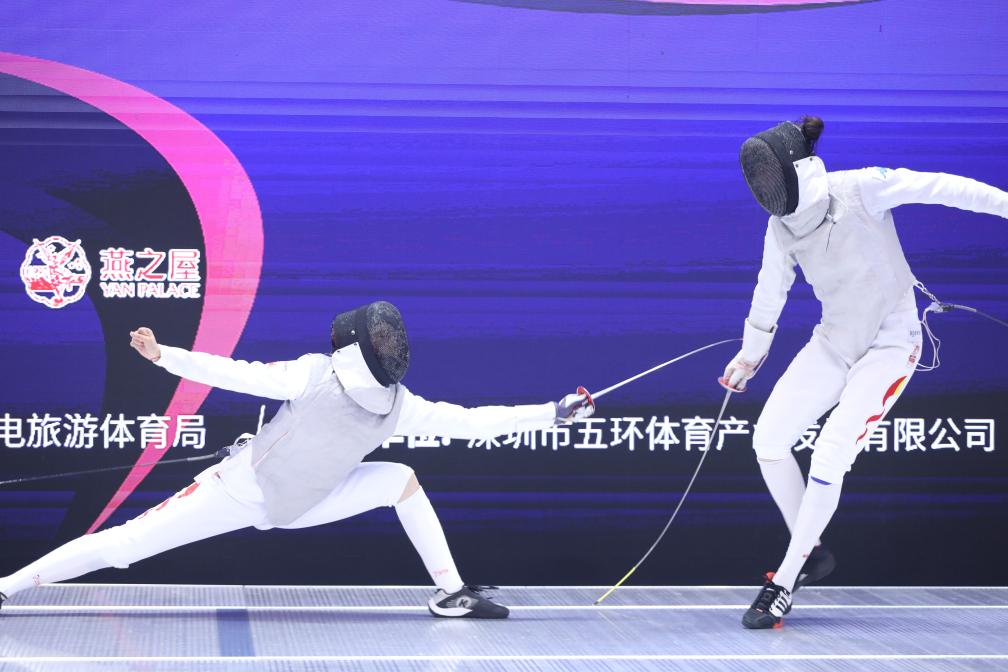 黃芊芊(左)在女子花劍個人決賽中對陣吳培林