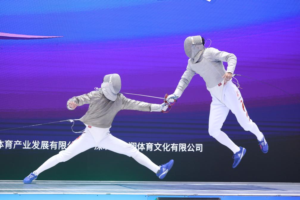 代銳(左)在男子佩劍個人決賽中對陣林霄