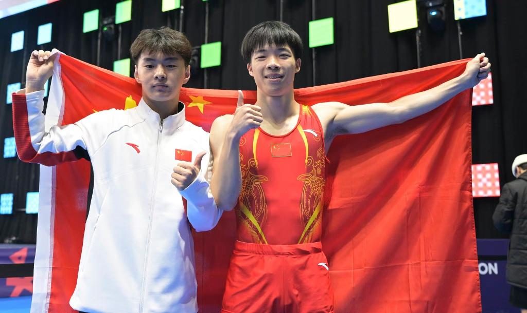 11月12日,王梓賽(左)與嚴浪宇在賽后合影。圖片來自國際體操聯(lián)合會官方社交媒體賬號
