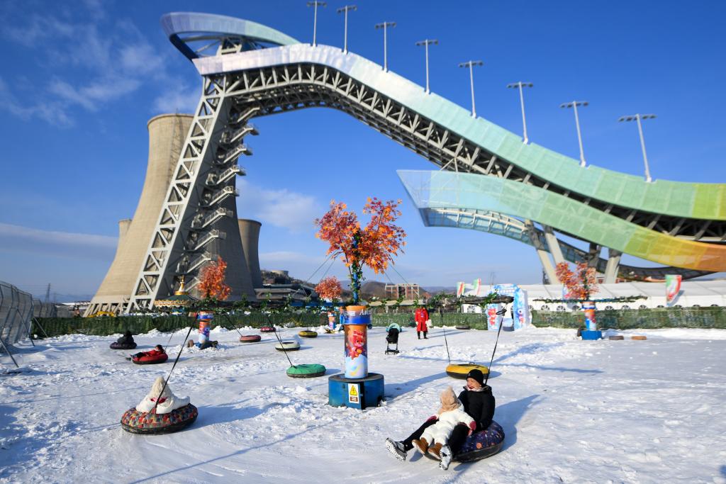 2023年12月24日,游客在首鋼滑雪大跳臺(tái)下的“首鋼園冰雪匯”體驗(yàn)雪上游樂項(xiàng)目。新華社記者 鞠煥宗 攝