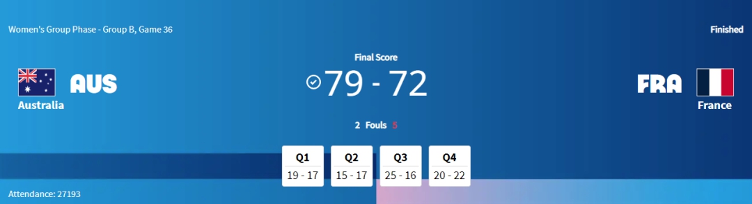 澳大利亞隊(duì)擊敗法國隊(duì)后,B組法國隊(duì)、尼日利亞隊(duì)、澳大利亞隊(duì)同為兩勝一負(fù),攜手出線。C組排名第3的比利時(shí)隊(duì)(凈勝分0)和中國隊(duì)(凈勝分-1)同為一勝兩負(fù),但前者凈勝分略微優(yōu)于中國隊(duì),因此壓哨出線。中國女籃遺憾出局。
