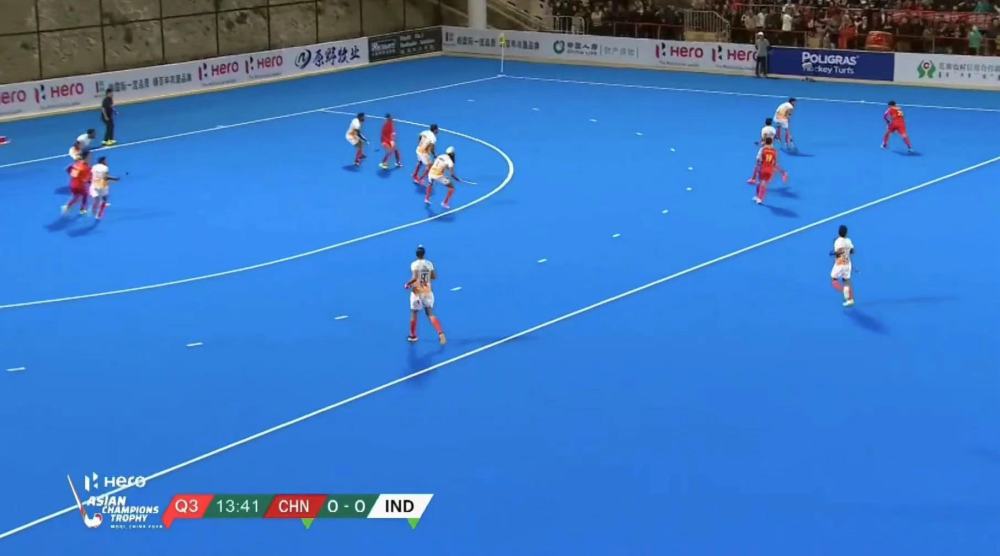 第二節(jié),面對(duì)印度隊(duì)的強(qiáng)勢(shì)進(jìn)攻,中國(guó)隊(duì)幾次成功搶斷,場(chǎng)面十分膠著。第三節(jié),印度隊(duì)在禁區(qū)內(nèi)攔球犯規(guī),中國(guó)隊(duì)獲得短角球,然而在印度隊(duì)嚴(yán)密的防守下射偏。隨著比賽的進(jìn)行,中國(guó)隊(duì)隊(duì)員體力有所下降,但依然在場(chǎng)上頑強(qiáng)拼搏。第四節(jié),印度隊(duì)通過團(tuán)隊(duì)配合取得進(jìn)球,中國(guó)隊(duì)調(diào)整戰(zhàn)術(shù),將守門員換下,全力進(jìn)攻,但未能扭轉(zhuǎn)局勢(shì),最終以0:1惜敗。