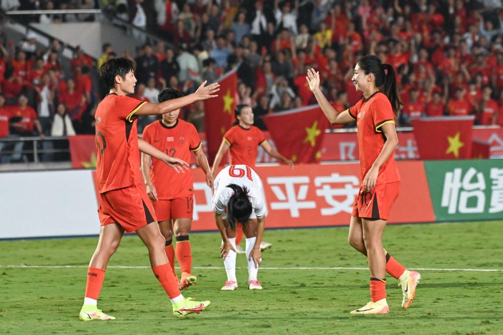10月29日,中國隊球員袁叢(前左)和王妍雯(前右)慶祝進(jìn)球。新華社記者 張子彧 攝
