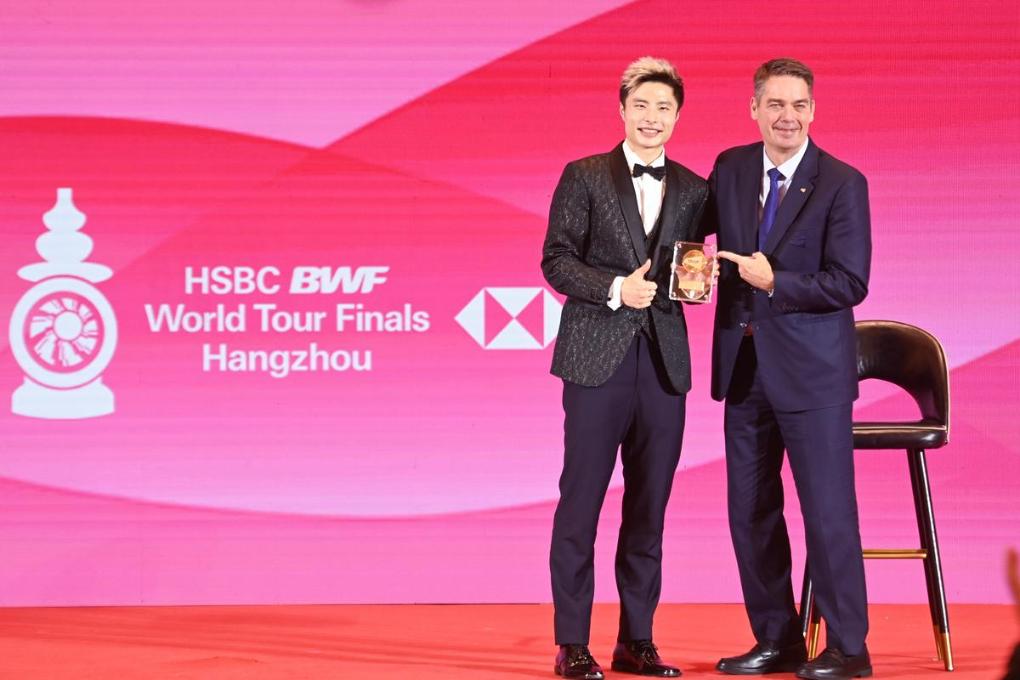 12月9日,世界羽聯(lián)主席拉爾森為獲得年度最佳男子單打運動員的中國選手石宇奇(左)頒獎。新華社記者 黃宗治 攝