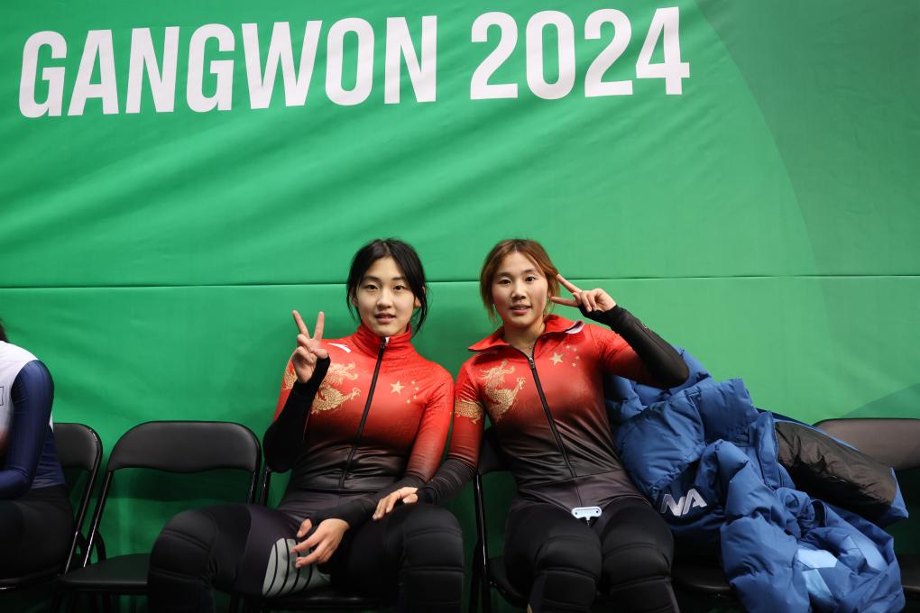 1月20日,中國選手楊婧茹(右)與李金恣在比賽后慶祝。當(dāng)日,在韓國江陵進(jìn)行的2024年江原道冬青奧會短道速滑女子1500米決賽中,中國運動員楊婧茹和李金恣分獲金、銀牌。新華社記者 許雅楠 攝