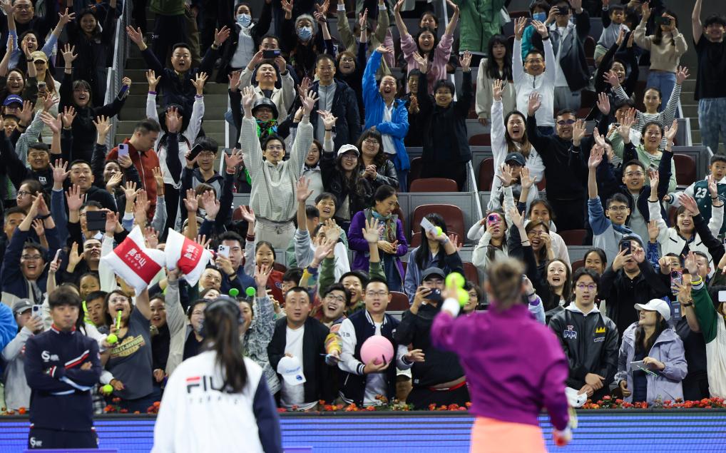 這是2024年9月30日,鄭欽文在2024中國網球公開賽女單第三輪比賽后和觀眾互動。新華社記者 白雪飛 攝