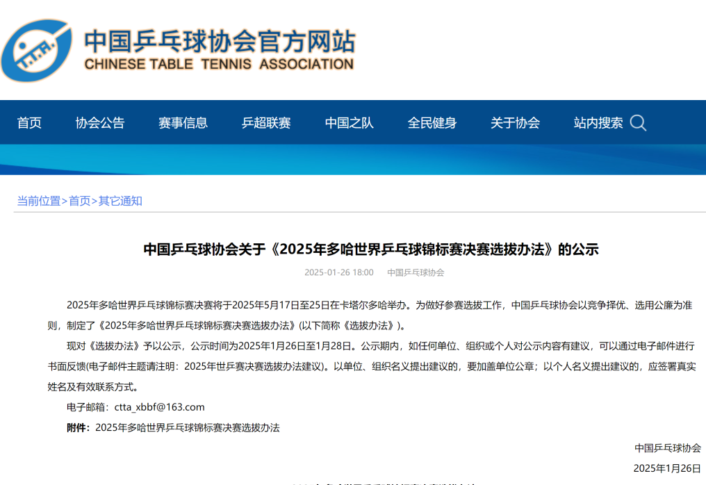 新華社北京1月26日電 中國乒協(xié)26日在官網(wǎng)公示了《2025年多哈世界乒乓球錦標(biāo)賽決賽選拔辦法》(以下簡稱《選拔辦法》)。