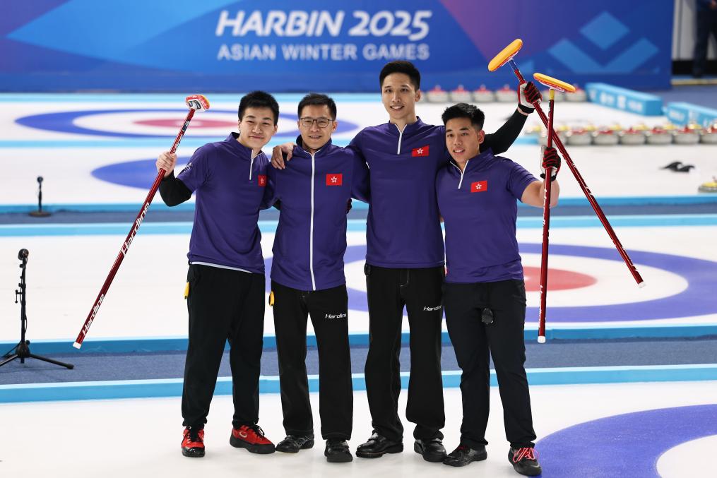 2月10日,中國(guó)香港隊(duì)選手鐘卓熙、張卓華、甄浩天、鄭政楠(左至右)在比賽后。新華社記者 鄭煥松 攝
