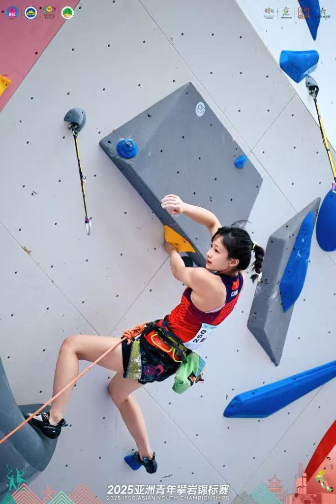 陳宣臻本屆比賽已收獲了U19組女子攀石銀牌。當(dāng)天的難度決賽中她倒數(shù)第二個出場,最終爬出了32+的成績,僅領(lǐng)先日本選手山真奈實一個出手奪冠。