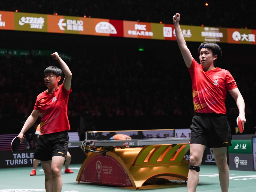 12月7日,王楚欽/孫穎莎(左)在混雙比賽中慶祝得分。新華社記者 王曦 攝