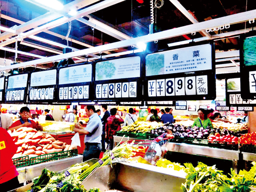 在超市水果專柜上,來自南方的許多熱帶水果價(jià)格偏高,本地和北方產(chǎn)的大眾水果價(jià)格適中。也有部分水果價(jià)格“喜人”,超市正在促銷的一種紅提葡萄品質(zhì)不錯(cuò),售價(jià)3.98元/斤,這個(gè)價(jià)格的紅提葡萄較往年同期便宜了整整一半,顧客爭(zhēng)相選購(gòu)。圖為9月8日市民在家家利超市購(gòu)買蔬菜。(魯明強(qiáng) 攝影報(bào)道)