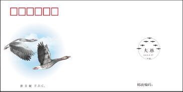 據(jù)悉,《大雁》首日封選用郝歐郵票未用稿。近景表現(xiàn)兩只飛翔的大雁,遠(yuǎn)景表現(xiàn)淡淡的天空,一動(dòng)一靜,彰顯畫面的節(jié)奏感。突出大雁的機(jī)敏、靈動(dòng)的特征。郵戳表現(xiàn)“人”字型雁陣,雁陣從頭到尾依長幼之序而排,稱作“雁序”凸顯大雁恭謙之意。(李冬梅)