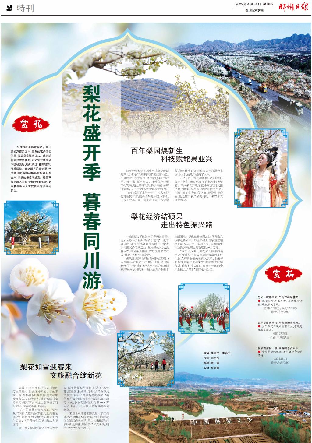 四月的原平春意盎然。同川鎮(zhèn)的萬畝梨園中,雪白的花朵如云似雪,層層疊疊綴滿枝頭。藍(lán)天映襯著如雪的花海,陽光穿過枝梢灑下斑駁光影,微風(fēng)拂過,花瓣輕舞,清香四溢。在這醉人的春光里,全國各地的游客和攝影愛好者紛至沓來,共賞這場花海盛宴。這里不僅是游人爭相打卡的春日仙境,更承載著梨鄉(xiāng)人世代傳承的堅(jiān)守與新生。