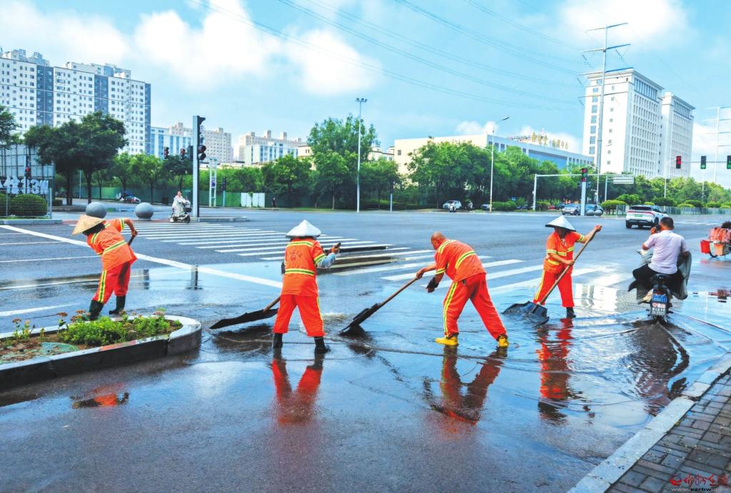 8月5日凌晨,我市降雨天氣造成城區(qū)部分道路路面積水。清晨,環(huán)衛(wèi)工人積極應(yīng)對(duì)雨情,對(duì)轄區(qū)內(nèi)路段開展排水清淤工作,保障市民日常出行。圖為環(huán)衛(wèi)工人在紫檀街路口清理積水。本報(bào)記者王陽(yáng)攝
