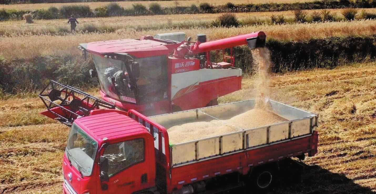 走進(jìn)基地,放眼望去,廣袤的田野上泛著溫暖的金黃色,成片的莜麥穗粒飽滿(mǎn),在風(fēng)中拂動(dòng),傳遞著豐收的信號(hào)。大型收割機(jī)隆隆作響,在麥浪中穩(wěn)步穿梭,村民們緊隨其后,人機(jī)協(xié)作,全力保豐收。