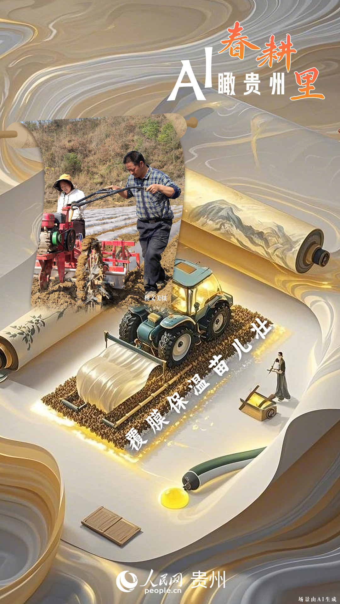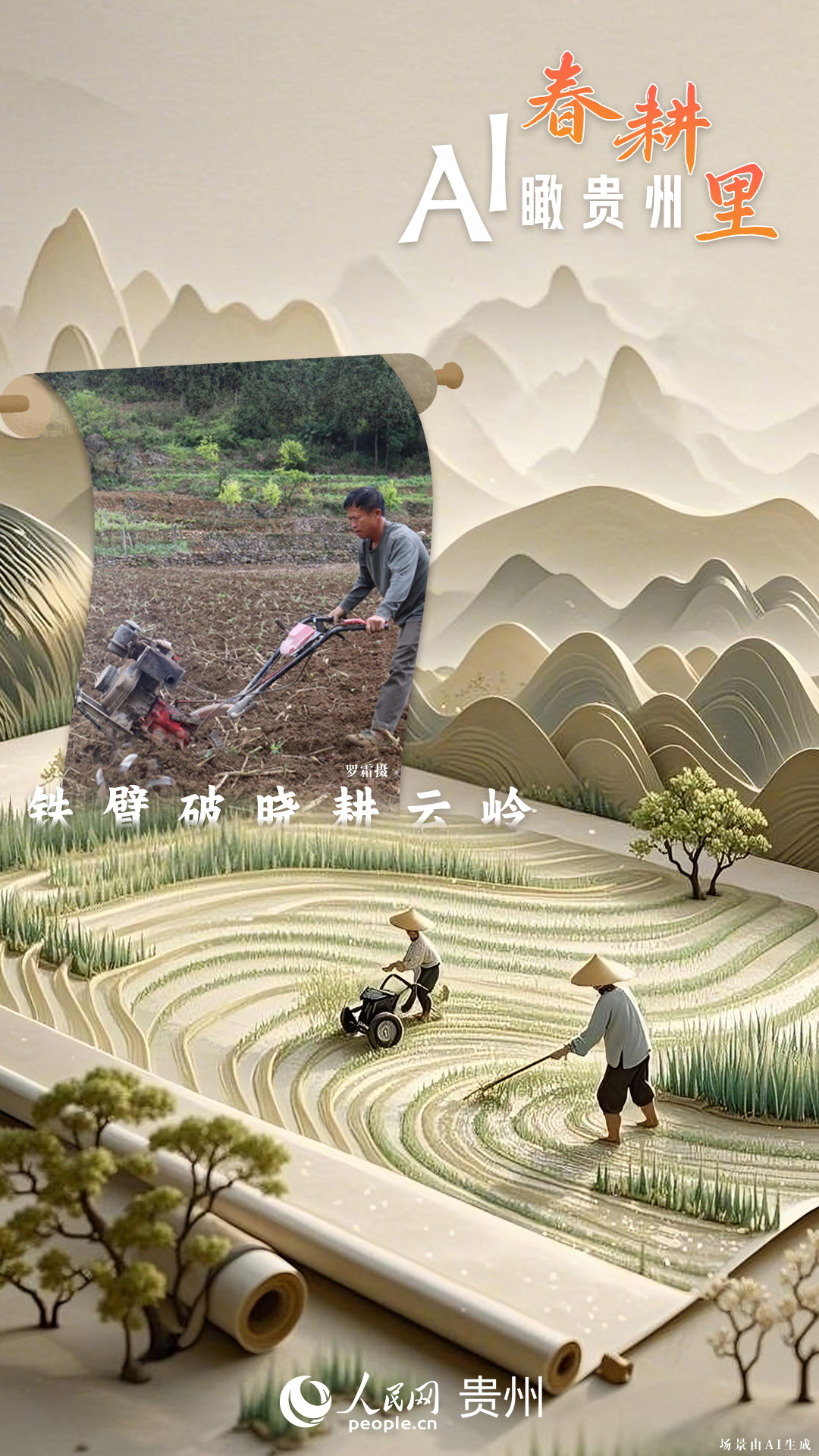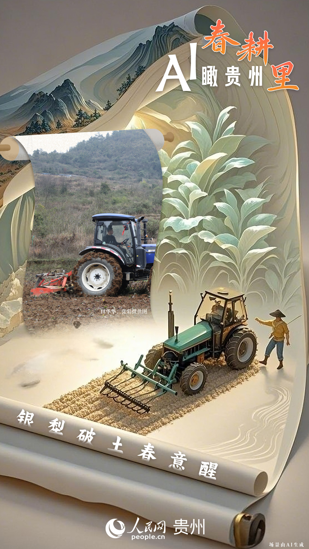 春回大地,萬物復蘇,黔地山川間正上演著一場生機勃勃的春耕盛景。傳統(tǒng)農(nóng)耕與現(xiàn)代科技在這里交織,描繪出一幅幅充滿希望的畫卷。 春耕不僅是農(nóng)時的序曲,更是科技與土地對話的現(xiàn)場。在貴州這片喀斯特地貌與民族文化交織的土地上,春耕正經(jīng)歷一場靜默的變革:無人機掠過千年梯田,算法解析紅壤墑情,覆膜機織就“智能外衣”,而彎腰勞作的農(nóng)人,依然用繭手傳遞著古老農(nóng)耕文明的溫度。 本期跟隨AI一起描繪貴州春耕里的故事。