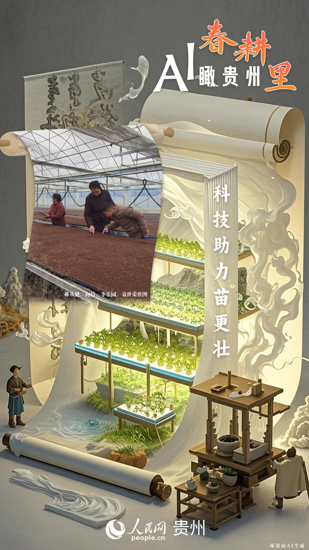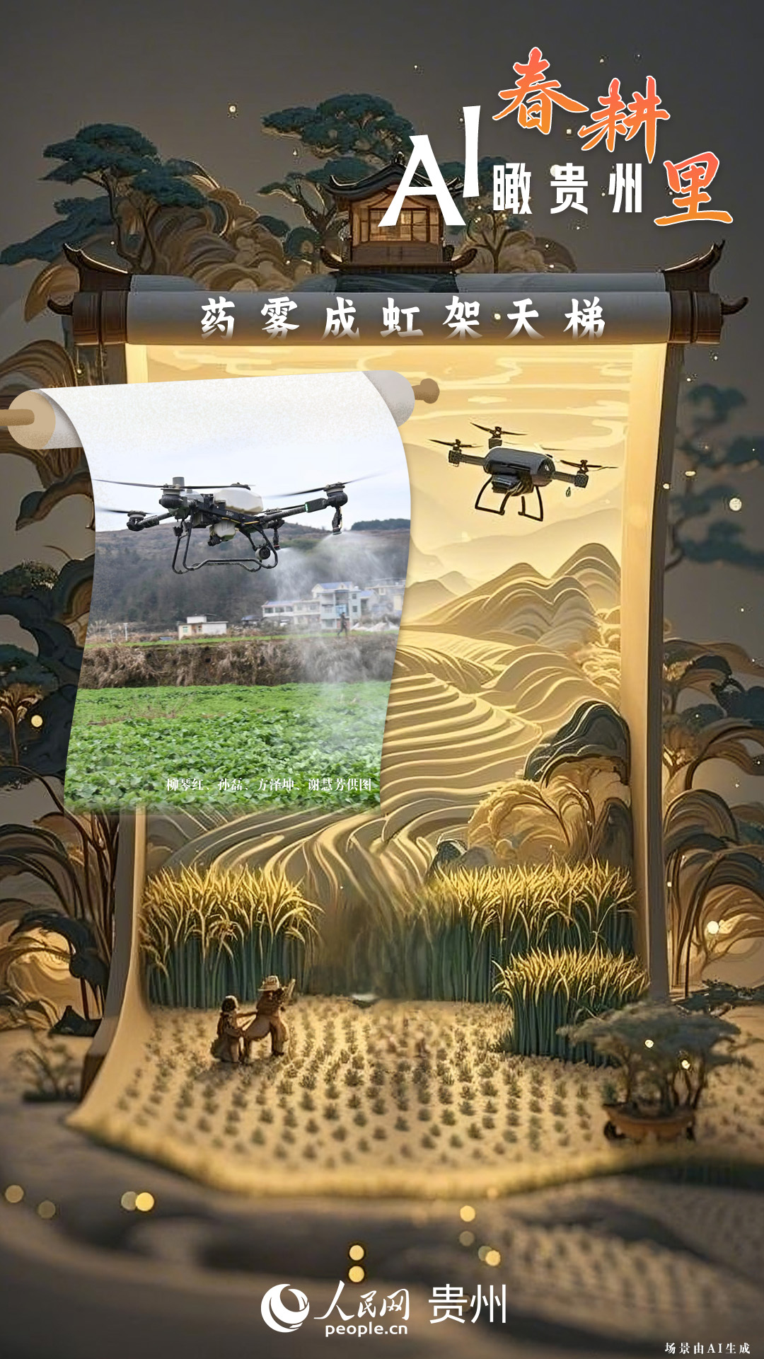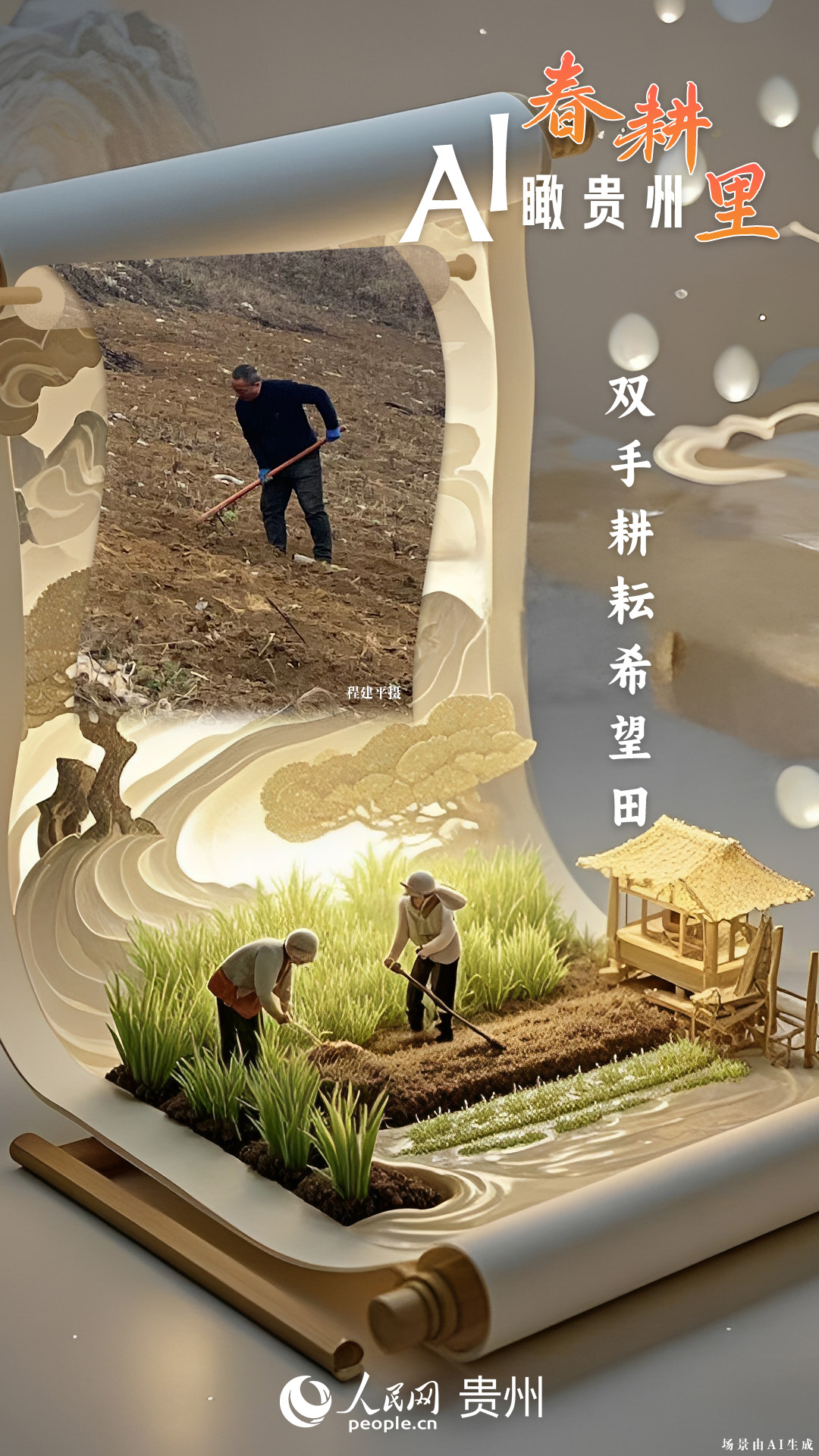 春回大地,萬物復蘇,黔地山川間正上演著一場生機勃勃的春耕盛景。傳統(tǒng)農(nóng)耕與現(xiàn)代科技在這里交織,描繪出一幅幅充滿希望的畫卷。 春耕不僅是農(nóng)時的序曲,更是科技與土地對話的現(xiàn)場。在貴州這片喀斯特地貌與民族文化交織的土地上,春耕正經(jīng)歷一場靜默的變革:無人機掠過千年梯田,算法解析紅壤墑情,覆膜機織就“智能外衣”,而彎腰勞作的農(nóng)人,依然用繭手傳遞著古老農(nóng)耕文明的溫度。 本期跟隨AI一起描繪貴州春耕里的故事。