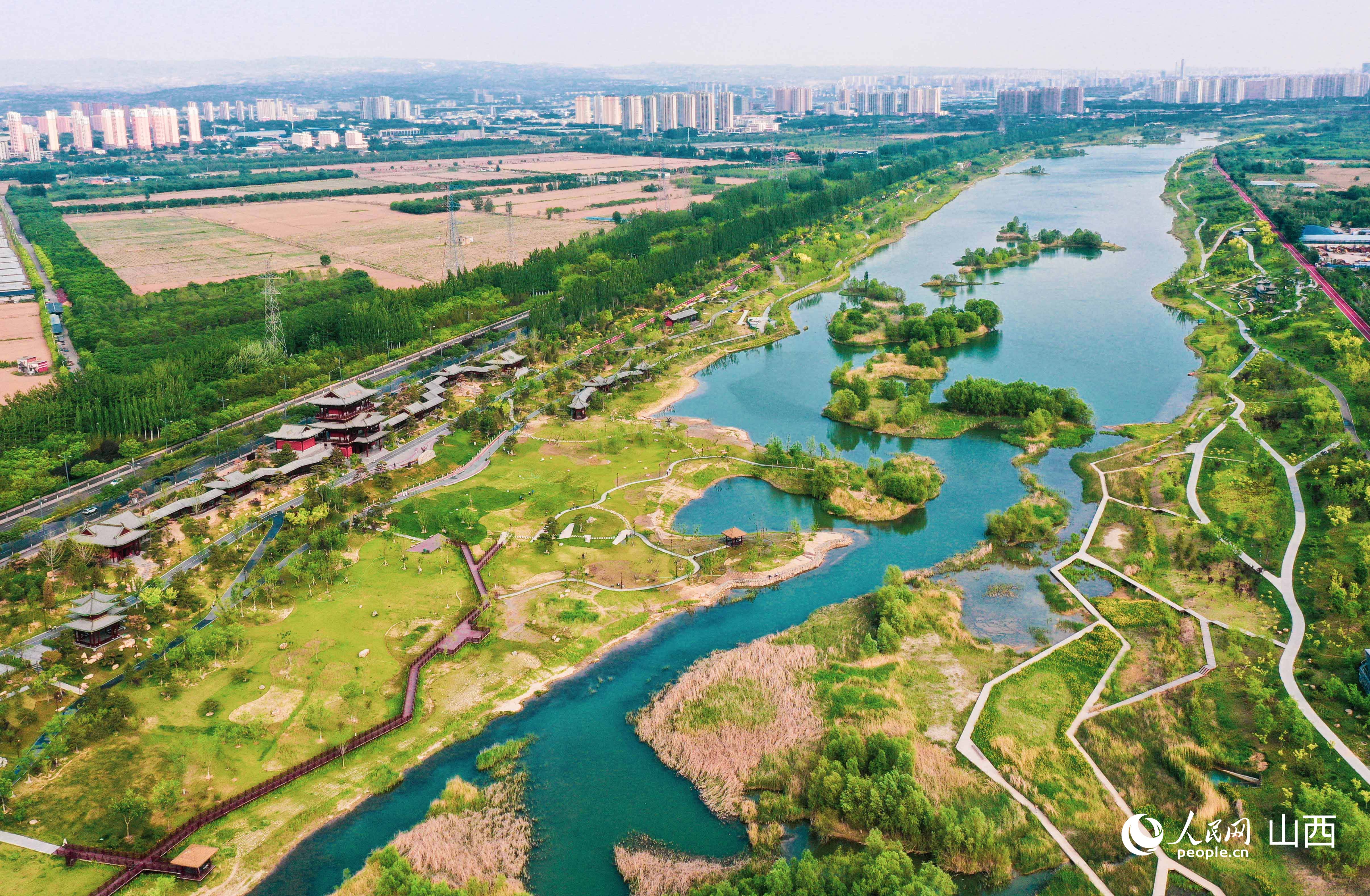 6月22日,俯瞰山西太原汾河四期濕地公園,雁丘園綠意盎然,水面波光粼粼,一派生機盎然,勾畫出一幅自然和諧的生態(tài)美景。