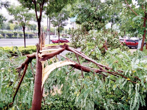 7月15日下午,忻州城區(qū)遭遇一場突如其來的暴風(fēng)雨襲擊,致使局部地區(qū)出現(xiàn)樹木被刮倒、樹枝被折斷、車輛被劃傷的現(xiàn)象。圖為忻州城區(qū)惠民小區(qū)院外道路邊的景觀樹被刮折。(魯明強 攝)
