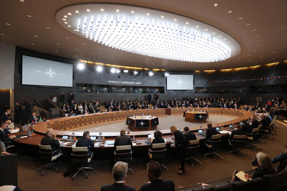 這是6月14日在比利時布魯塞爾北約總部拍攝的北約防長會現(xiàn)場。北約秘書長斯托爾滕貝格14日說,北約成員國國防部長當(dāng)天批準(zhǔn)了一項(xiàng)旨在由北約協(xié)調(diào)對烏克蘭軍事援助和訓(xùn)練的計(jì)劃。北約防長會13日至14日在布魯塞爾舉行。新華社記者趙丁喆攝