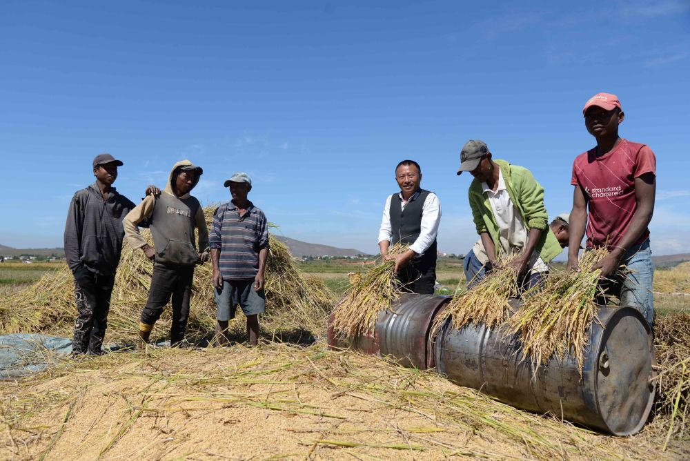 在馬達加斯加首都塔那那利佛附近的馬義奇鎮(zhèn),中國雜交水稻技術專家胡月舫(右三)在中國國家雜交水稻工程技術研究中心非洲分中心的試驗田里和當?shù)剞r民一起收獲水稻(2023年5月12日攝)。新華社發(fā)(西塔卡·拉喬納里松 攝)