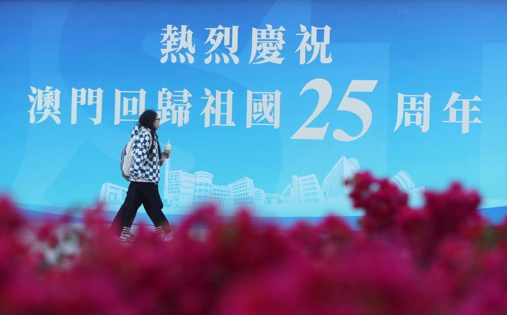 12月17日,行人經(jīng)過澳門科技大學(xué)校園內(nèi)的一處慶祝海報(bào)。新華社記者 姚琪琳 攝