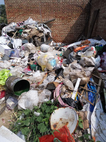 8月2日上午,在村民的陪同下來(lái)到匡村村南,在忻州烈士陵園背后一個(gè)叫周家(音)墳的地方,看到路口黑色的玉米桿躺放在井蓋上,生銹的用鋼管焊成的院門兩邊和門口,堆放著五顏六色的塑料袋以及廢塑料和破鐵桶等生活垃圾破爛,連院內(nèi)也同樣是垃圾。