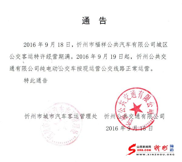 2016年9月18日,忻州市福祥公共汽車(chē)有限公司城區(qū)公交客運(yùn)特許經(jīng)營(yíng)期滿。2016年9月19日起,忻州公共交通有限公司純電動(dòng)公交車(chē)按現(xiàn)運(yùn)營(yíng)公交線路正常運(yùn)營(yíng)。