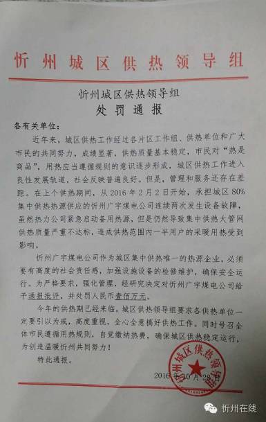 忻州城區(qū)供熱領(lǐng)導組處罰通報