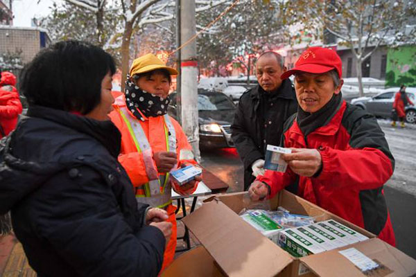 圖說:蔣愛榮(右一)為環(huán)衛(wèi)工人分發(fā)愛心人士捐贈(zèng)的感冒藥(11月23日攝)。圖片來源:新華社