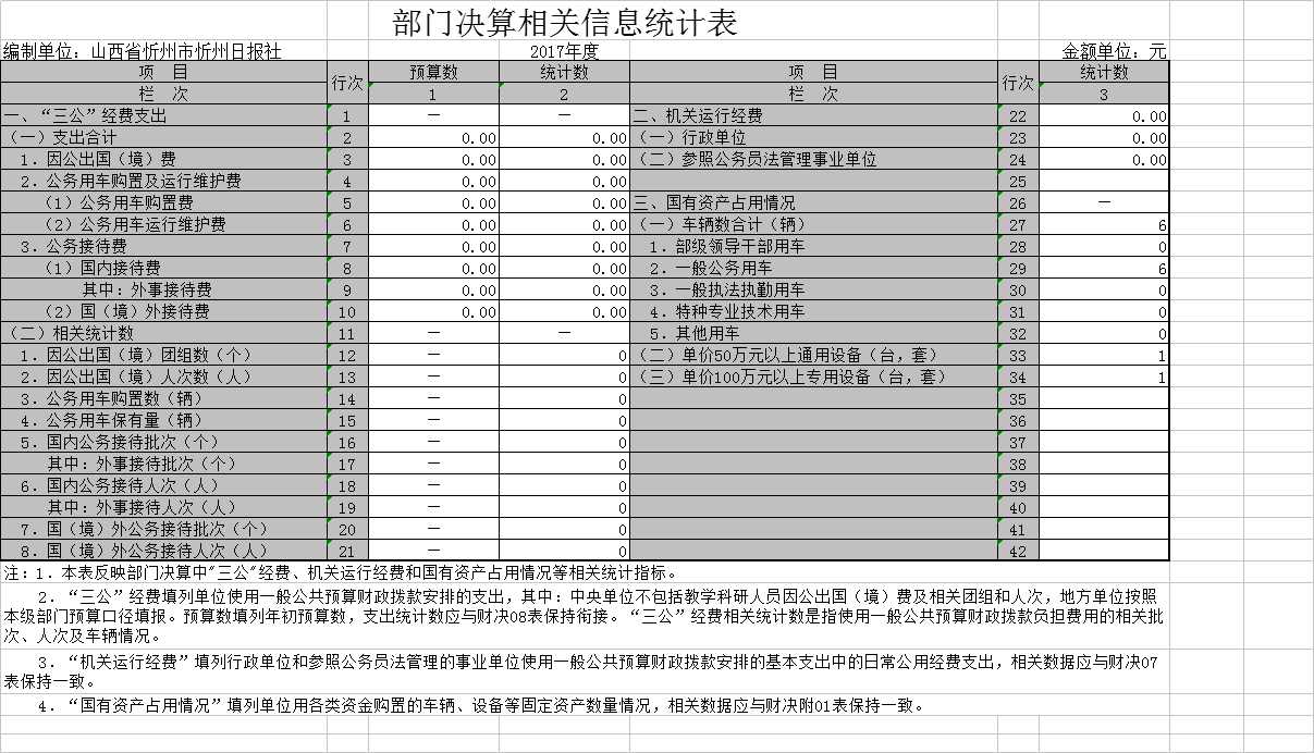 忻州日?qǐng)?bào)社是全額事業(yè)單位,財(cái)政只撥付人員經(jīng)費(fèi)。我單位從財(cái)政撥款中沒(méi)有支出“三公經(jīng)費(fèi)”,“三公經(jīng)費(fèi)”數(shù)字為0,故有關(guān)“三公經(jīng)費(fèi)”的內(nèi)容均為0。一般公共預(yù)算“三公”經(jīng)費(fèi)支出表、“三公”經(jīng)費(fèi)增減變化原因及因公出國(guó)、公務(wù)用車及公務(wù)接待等項(xiàng)均無(wú)數(shù)字。