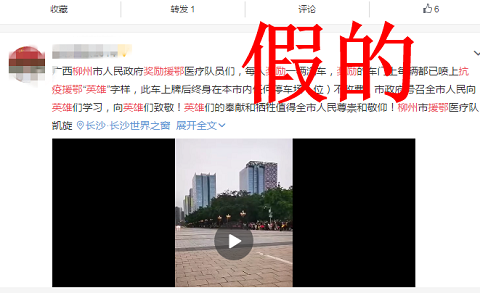 在一些微信群里,“柳州市獎(jiǎng)勵(lì)援鄂醫(yī)療隊(duì)員們,每人獎(jiǎng)勵(lì)一輛汽車(chē),獎(jiǎng)勵(lì)的車(chē)門(mén)上每輛都已噴上抗疫援鄂‘英雄’字樣,此車(chē)上牌后終身在本市內(nèi)任何停車(chē)場(chǎng)(位)不收費(fèi)”的信息比比皆是。在抖音和微博平臺(tái),還有不少網(wǎng)友以該信息為基礎(chǔ),配上了迎接援鄂抗疫英雄回柳的畫(huà)面,制作成了短視頻在網(wǎng)絡(luò)上傳播,加劇了虛假信息進(jìn)一步傳播。