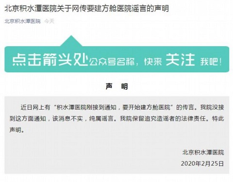 人民網(wǎng)北京2月25日電 據(jù)北京積水潭醫(yī)院官方微信公眾號消息,針對近日網(wǎng)上有“北京積水潭醫(yī)院剛接到通知,要開始建方艙醫(yī)院”的傳言,院方回應(yīng),沒接到這方面通知,該消息不實(shí),純屬謠言。